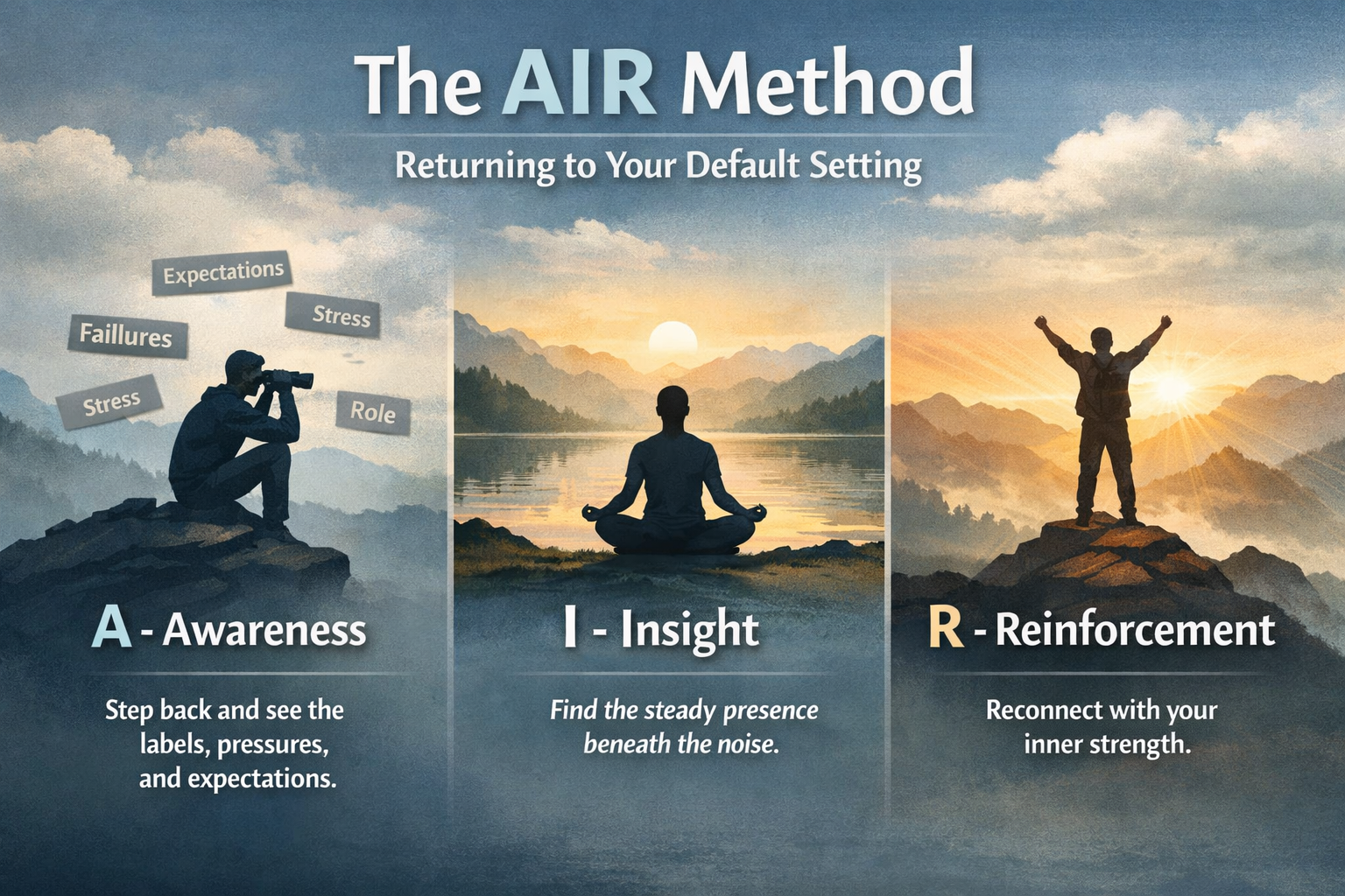 The AIR Default Setting Method is a simple three-part process designed to help you recalibrate your life back to your natural state of clarity, resilience, and strength.